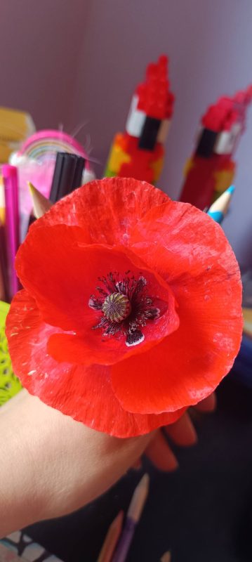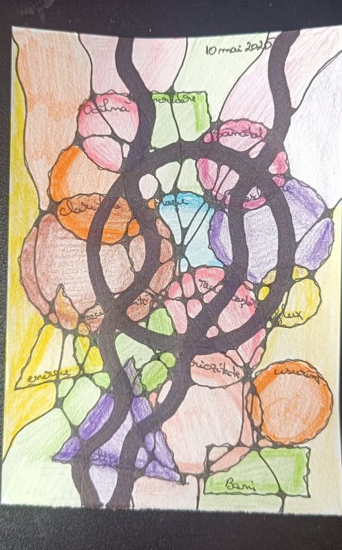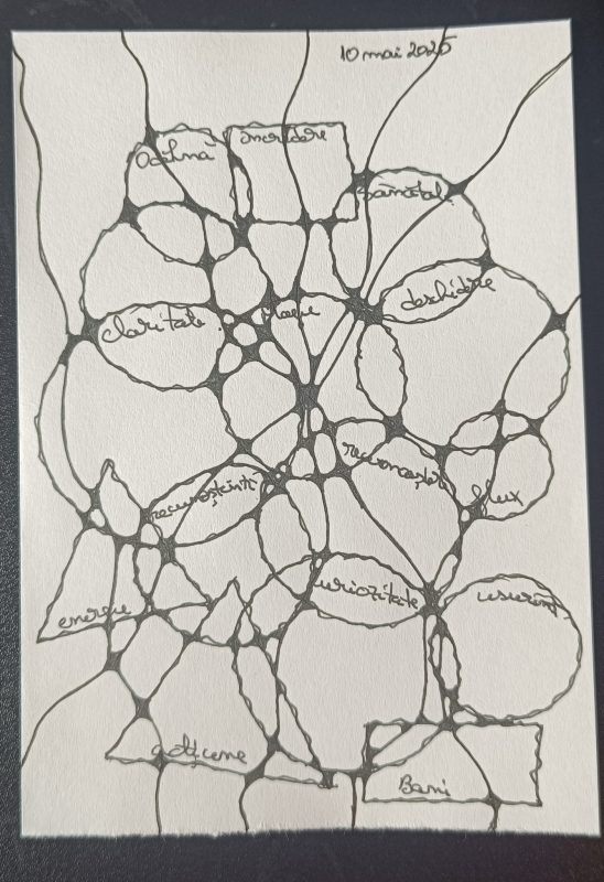Primul cuvânt care mi-a veni în minte a fost MAGIE, pentru că fiecare zi mie mi se pare magică. În timp ce desenam, au venit copiii mei la mine și mi-au adus un mac. Practic, mi-au trimis un semn că MAGIA există, că ziua mea e deja magică și că, creierul meu deja a făcut conexiunile neuronale pentru o zi magică,a trimis către Univers mesajul unei zile magice și Universul mi-a transmis magia prin copiii mei și prin acest MAC roșu.