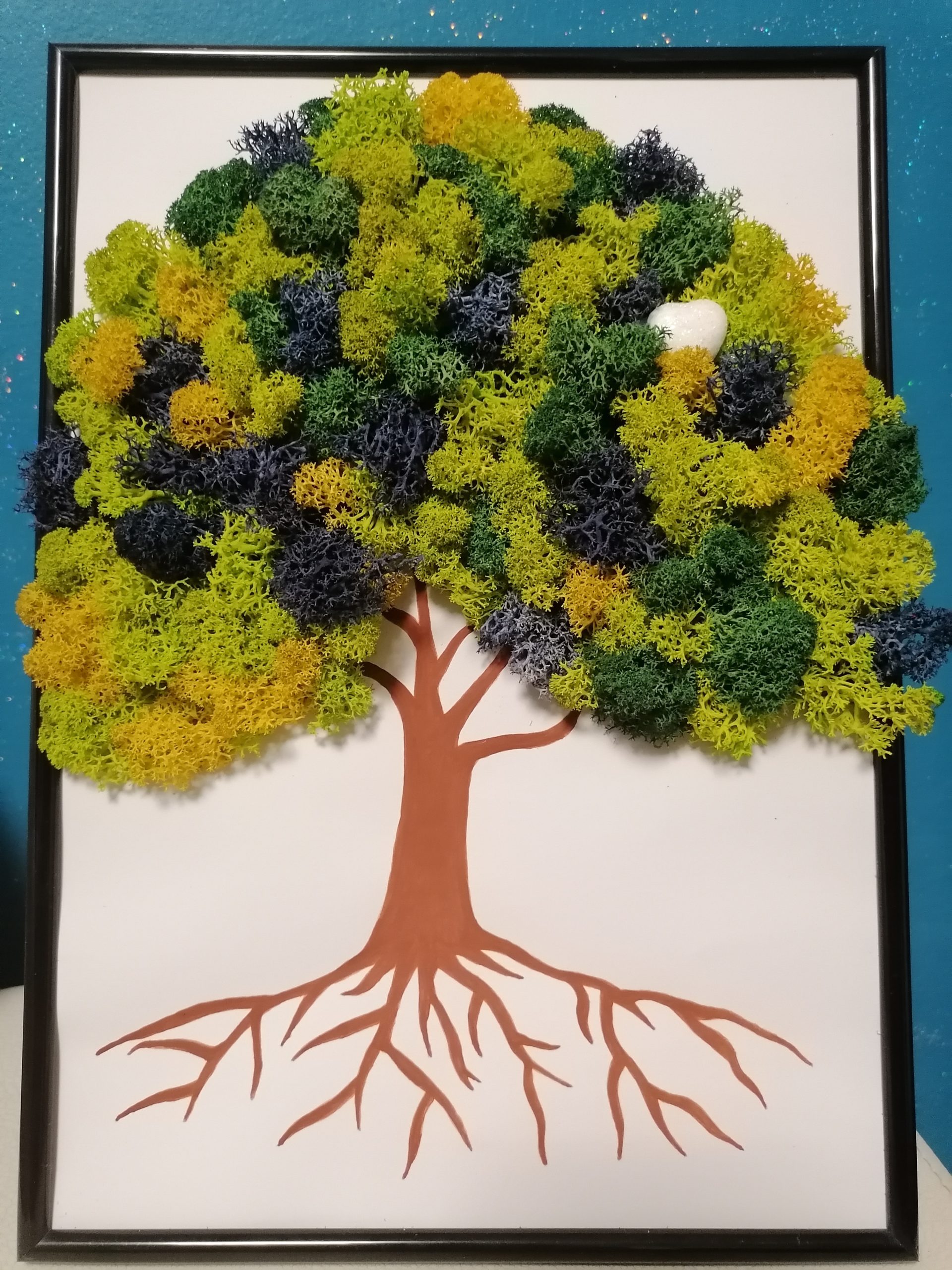 Copacul are coroana realizată din licheni stabilizați și trunchiul pictat.