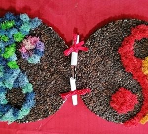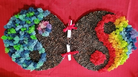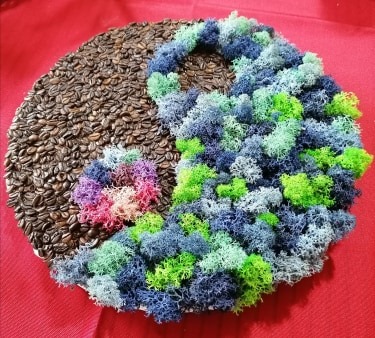 Tabloul este realizat pe pânză, din licheni și boabe de cafea.