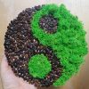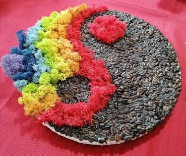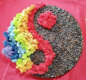 Tabloul este realizat pe pânză, din licheni și boabe de cafea.